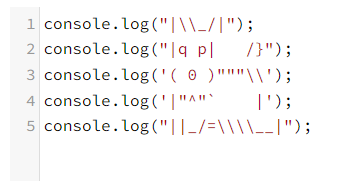 말 그대로 개를 출력하면 되는 문제이며 한 줄 단위로 끊어서 작성하시면 쉽게 풀 수 있습니다. 단 javascript에서 이스케이프(\)를 출력할려면 \\로 작성하셔야 하며 싱글쿼터, 더블쿼터를 출력하실려면 문자열을 출력할 쿼터와 다른 쿼터로 감싸셔야 합니다. 정리하면 다음과 같습니다.