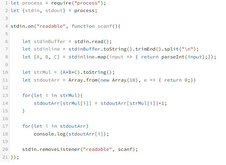 자릿수 체크가 전부 끝났다면 for문을 돌려 stdoutArr의 각 요소를 출력합니다. 즉 stdoutArr에서 0~9인덱스들의 카운트 값들이 출력되는 것입니다.
