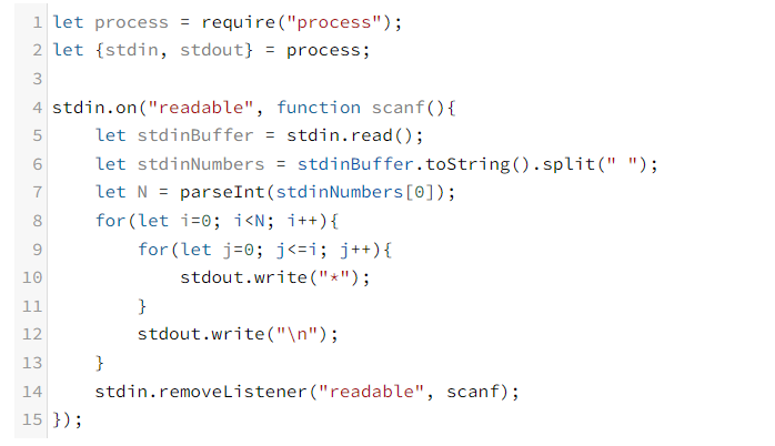 표준 입출력 스트림을 가져옵니다. 이전 코드에선 표준 입력 스트림만 가져왔지만 이번 코드에서는 표준 출력 스트림도 가져왔습니다. javascript에서 기본적으로 제공하는 console.log 메소드는 표준 출력 스트림에 개행을 자동으로 추가해주므로 개행 자동 추가를 방지하기 위해 표준 출력 스트림에 직접 접근할 계획입니다.